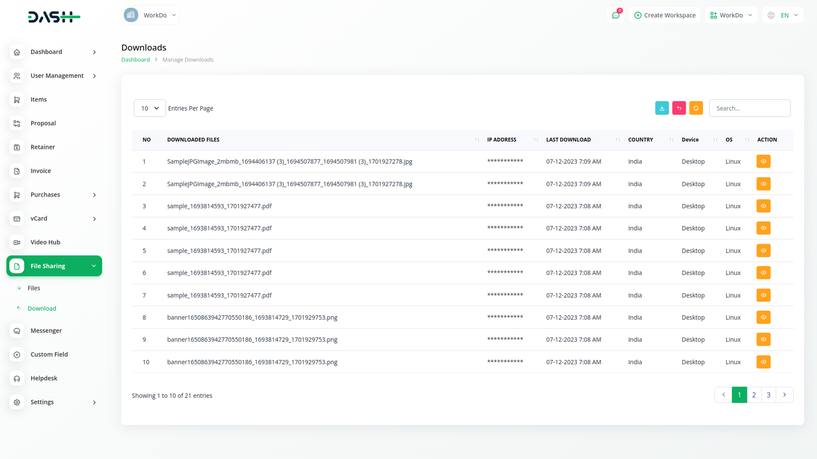 In file download management, you can know and view file name, IP address, date, country, device, OS etc. when a file is downloaded.