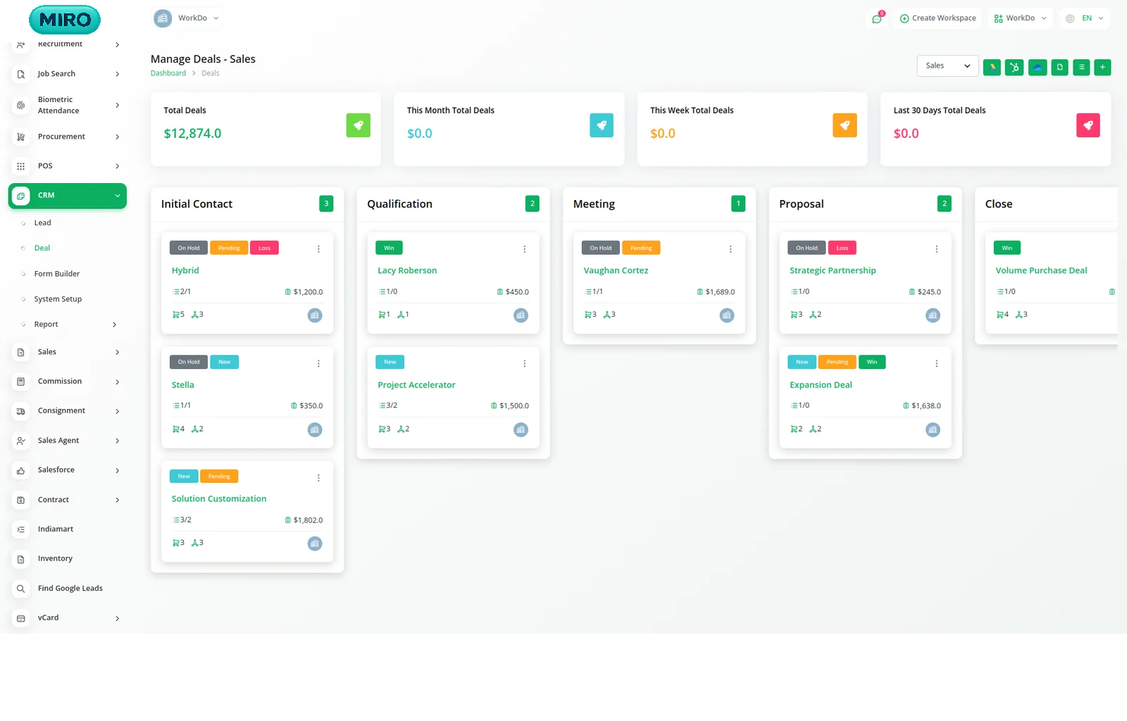 Sezgisel bir arayüzle işinizin her yönünü kolayca ölçün. Daha etkili satışlar sağlayan içgörüler oluşturun ve sorunsuz bir sürükle-bırak sistemiyle potansiyel müşterilerinizi ve anlaşmalarınızı yönetin.